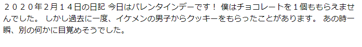 2020年2月14日の日記 今日はバレンタインデーです!僕はチョコレートを1個ももらえませんでした。しかし、過去に一度だけイケメンの男子からクッキーをもらったことがあります。あの時一瞬、別の何かに目覚めそうでした。
