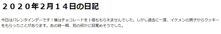 <h1>2020年2月14日の日記</h1> <p> 今日はバレンタインデーです!僕はチョコレートを1個ももらえませんでした。しかし過去に一度、イケメンの男子からクッキーをもらったことがあります。あの時一瞬、別の何かに目覚めそうでした。 </p>