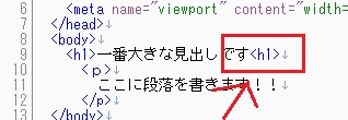 今回はbodyタグの中に書く ということに注意してください。 h1タグというのは見出しを意味します。