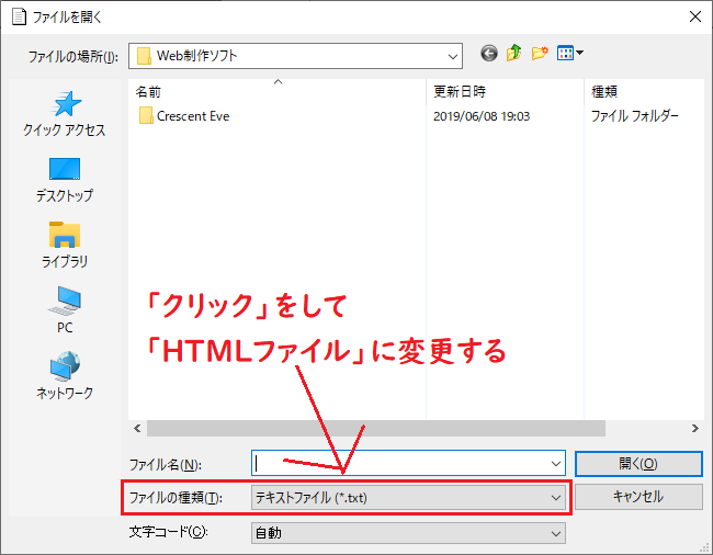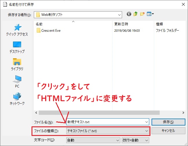 「ファイルの種類」を「HTMLファイル」に変更