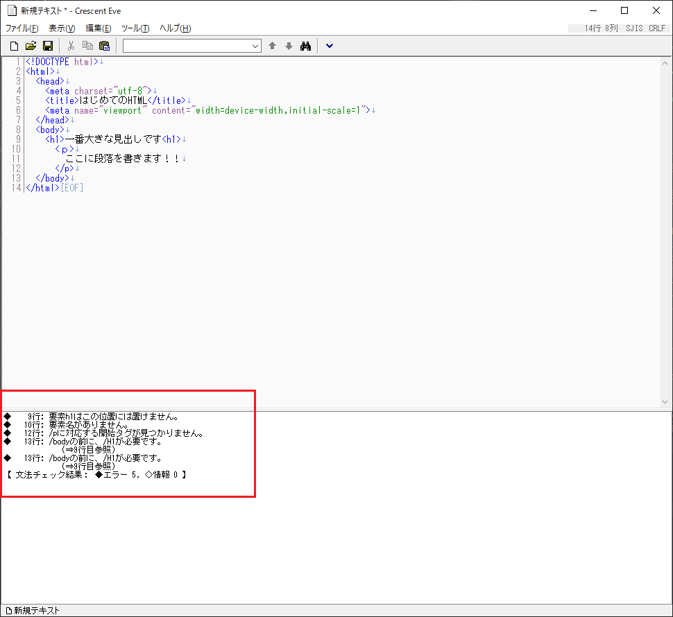 となります。 「/(スラッシュ)」が抜けていました。 タグの閉じ忘れには気を付けましょう。 こうして問題を解決してみたら、 その都度「F7キー」を押す、ということをおすすめします。