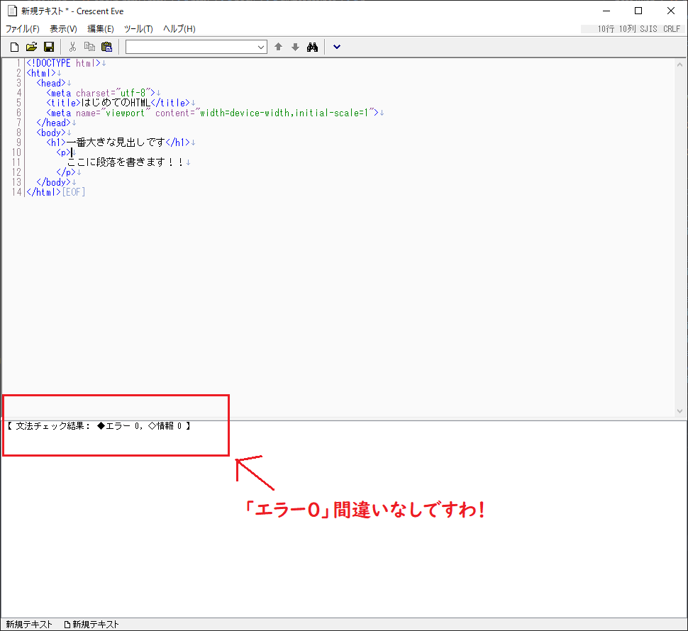 【10】「bodyタグ」の中に、pタグを作り、 その中身を書く。
